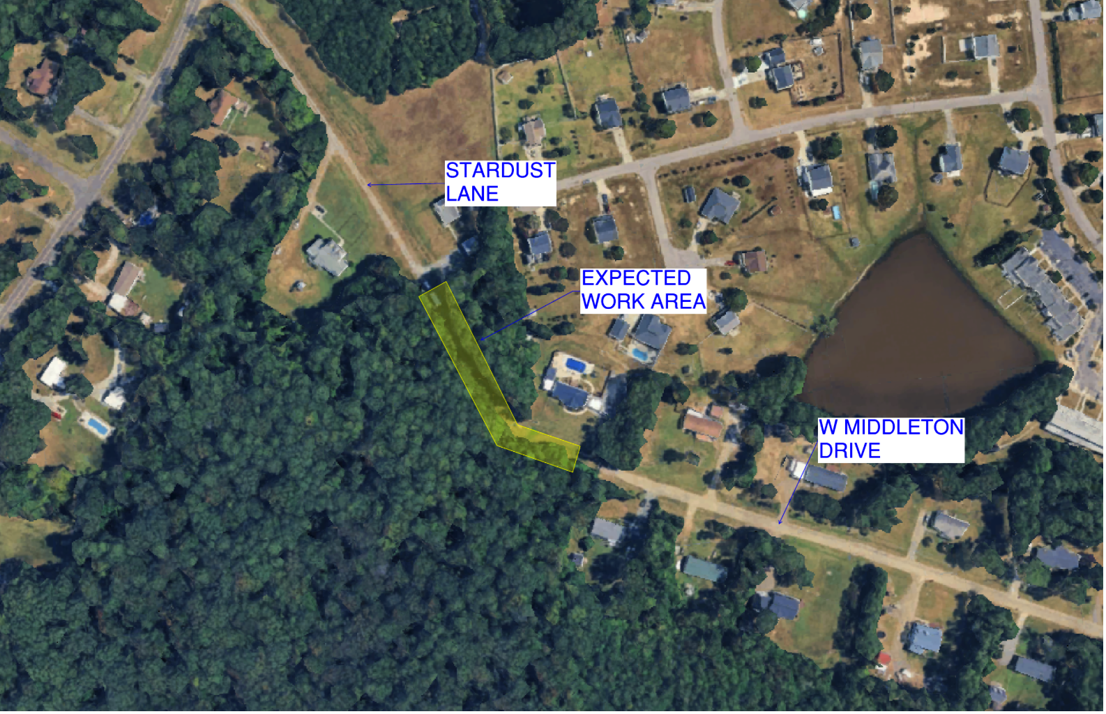 JF Wilkerson’s subcontractor has requested to work this Saturday, March 7, 2026, on the 24-inch force main installation near the end of West Middleton Drive, primarily in the area between Stardust Lane and West Middleton Drive, near nearby residences.